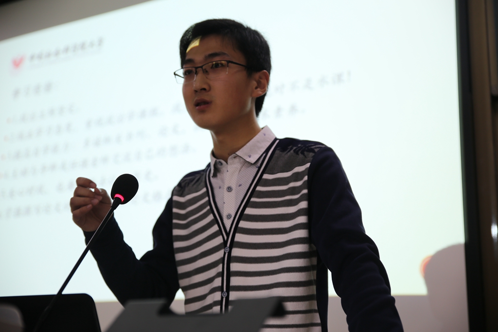 首先,徐啟瑞與丁鐸棟兩位主講人從日常學(xué)習(xí)和考前復(fù)習(xí)兩方面分享了中共黨史、大學(xué)計算機基礎(chǔ)、馬克思主義基本原理等公共必修課程的學(xué)習(xí)經(jīng)驗。他們的分享既有對不同學(xué)科的總體概述,又包含記憶方法、答題方法等具體內(nèi)容,幫助同學(xué)們學(xué)習(xí)與備考。隨后,來自七個不同專業(yè)的同學(xué)關(guān)于學(xué)習(xí)和復(fù)習(xí)方面分別分享了“以考代考”、“將一本書讀成一張A4紙”等各種不同的經(jīng)驗和策略,并推薦了一些與專業(yè)相關(guān)的書籍以及有助于同學(xué)們學(xué)習(xí)與生活的app。