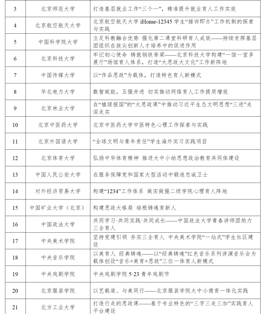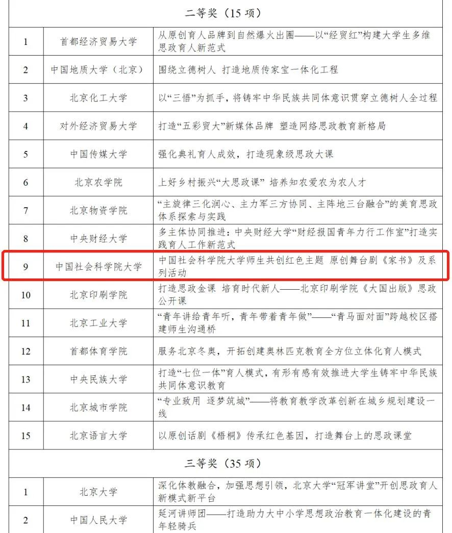 為深入貫徹黨的二十大精神,深化轉化北京高校學習貫徹習近平新時代中國特色社會主義思想主題教育成果,全面實施“時代新人鑄魂工程”,交流推廣高校在大學生思想政治工作中的突出成果和典型經驗,市委教育工委組織開展了第七屆首都大學生思想政治工作實效獎申報和評選工作。經材料審核、專家初評、交流展示等環節,共評選出特等獎5項、一等獎10項、二等獎15項、三等獎35項。我校師生共創紅色主題原創舞臺劇《家書》及系列活動榮獲二等獎。完整獲獎名單如下: