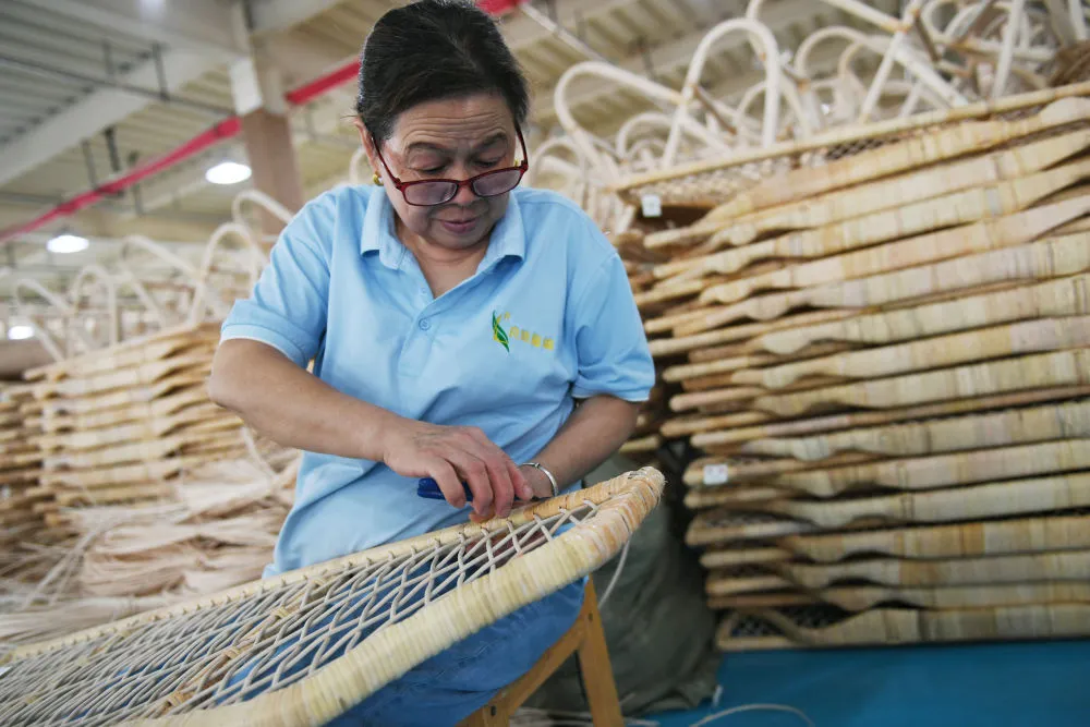2023年9月7日,在位于漢中市的陜西良順匠心實業有限公司,工作人員在編織藤制品。新華社記者 張曼怡 攝