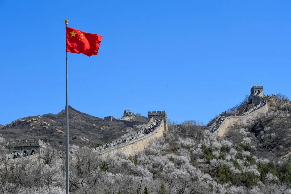 2024年4月7日,游客在山花盛開的八達嶺長城觀光游覽。新華社記者 鞠煥宗 攝