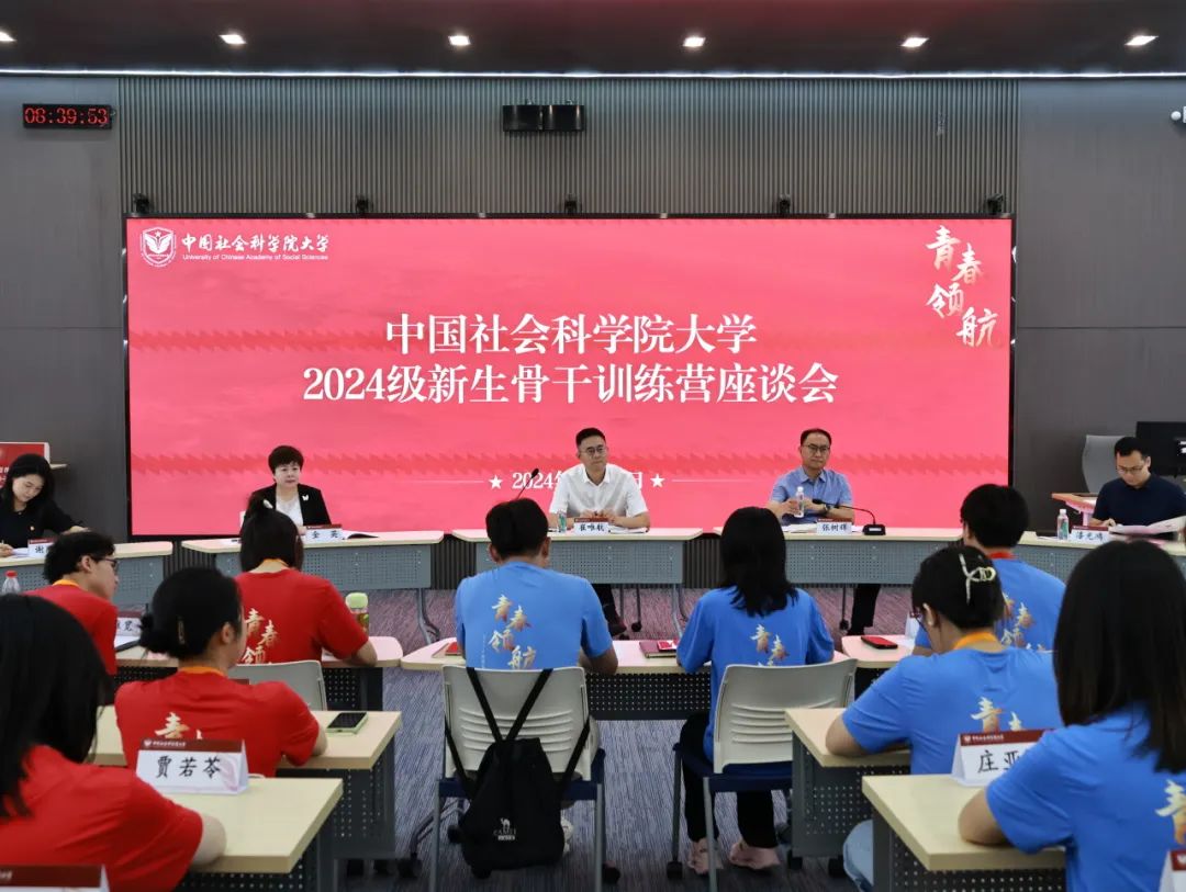 座談會上,2023級新生骨干訓練營學員代表孫麗果、詹洵梓分享了心得體會。他們回顧了參加骨干營以來一年時光里的學習和成長經歷,并鼓勵新學員珍惜學習機會,不斷超越自我,向著光、追逐光、成為光,成就更好的自己。2024級新生骨干訓練營學員代表童培霖、韓澤宇、尹濤、劉唯寬、牟思源就自己對學校的初印象、來到社科大的緣由以及對未來的期冀等進行分享。新的環境、新的挑戰,同學們對未來的校園生活充滿期待。