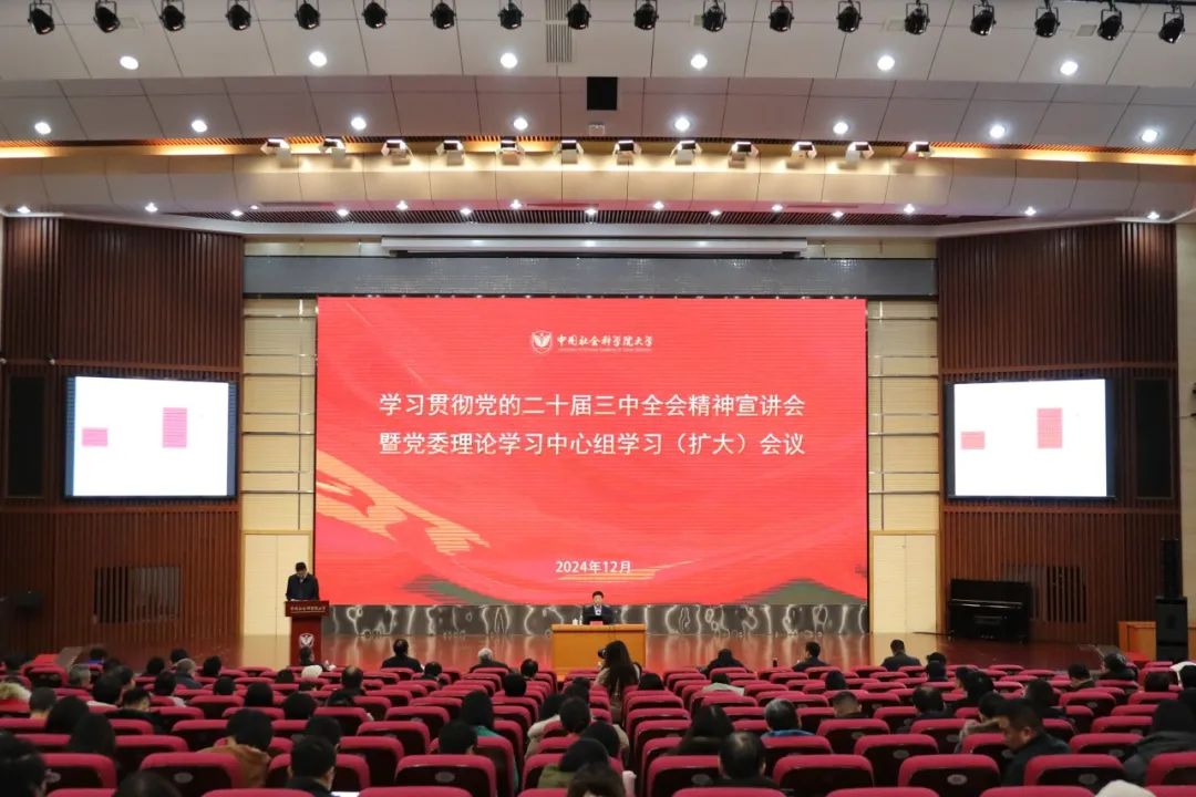 12月6日,中國社會科學院大學舉行學習貫徹黨的二十屆三中全會精神宣講報告會暨黨委理論學習中心組學習(擴大)會議。中國社會科學院經濟研究所所長、研究員,院學習貫徹黨的二十屆三中全會精神宣講團成員李雪松作宣講報告,校黨委書記崔唯航主持并講話,黨委常務副書記、校長張政文,黨委常委、副校長王啟梁、張樹輝、高文書、姜飛,校長助理展龍參加會議。
