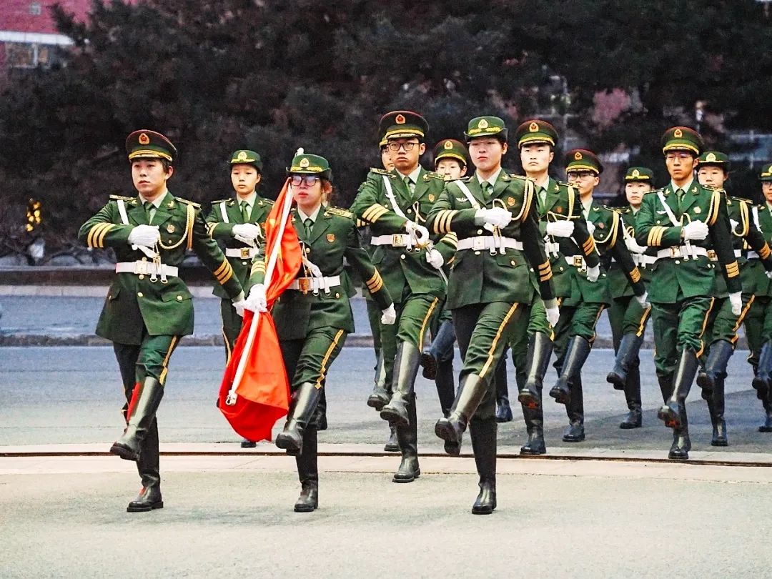 伴隨響亮的口令,國旗護衛隊隊員邁著鏗鏘有力的正步,莊嚴地護送國旗到升旗臺。