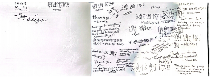 此次交流不僅加深了中美兩國師生間的友誼和相互理解,也為促進(jìn)國際間文化交流搭建了一個(gè)良好的平臺(tái)。送別時(shí)刻,美國師生為社科大組織團(tuán)隊(duì)獻(xiàn)上了手寫感謝信。同學(xué)們紛紛表示,本次交流活動(dòng)幫他們更好地了解了全面的、真實(shí)的中國,他們更加了解、喜愛中國,十分愿意向朋友介紹中國文化。此次活動(dòng)受到了美國師生和家長的高度肯定。